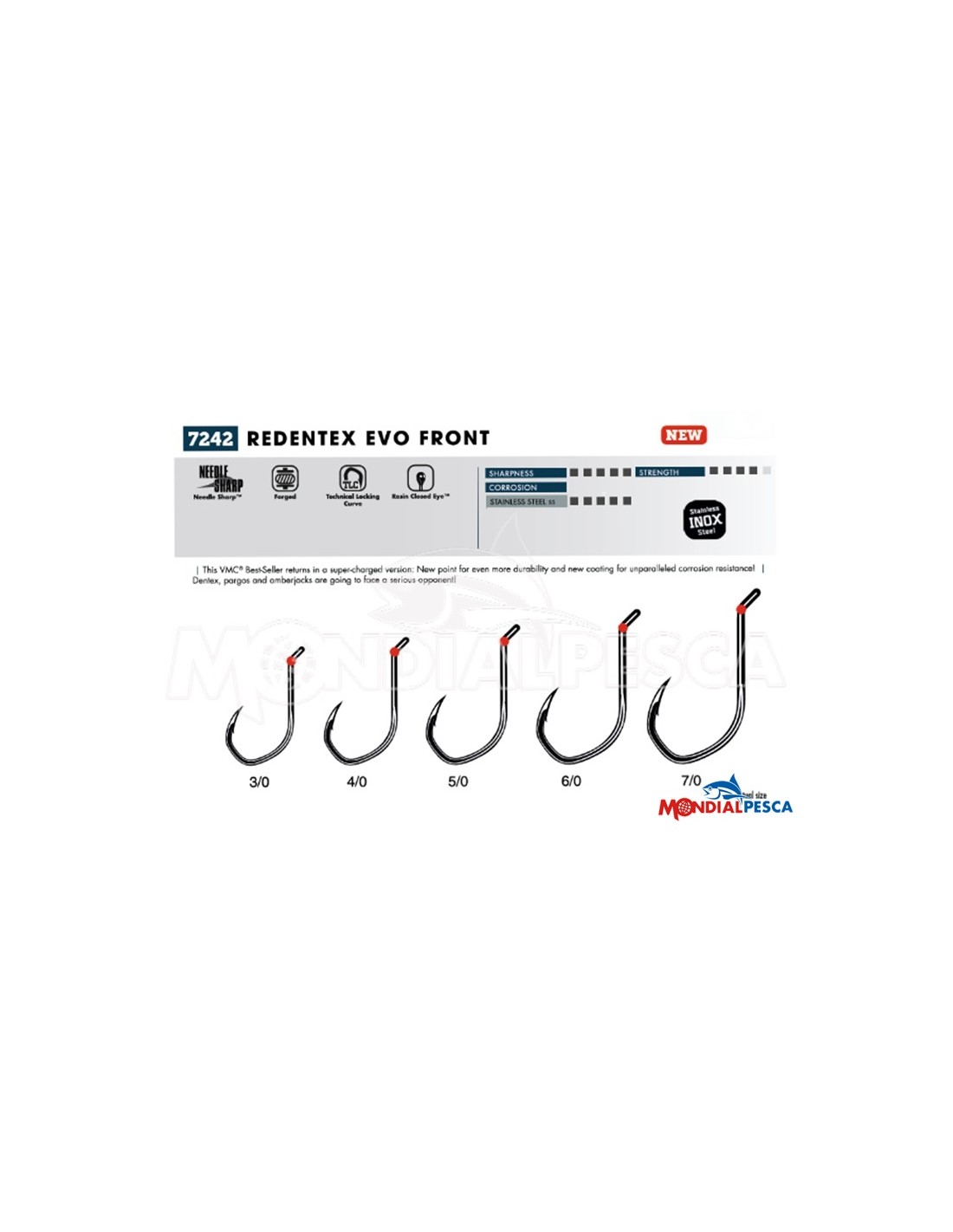 Nonostante il successo indiscusso degli ami VMC ReDentex+, nasce la nuova versione in acciaio inox ReDentex EVO. Uguale nella forma e nelle taglie, il cambiamento sta nell’ impiego dei materiali; l’acciaio inox con cui viene prodotto, oltre a migliorarne le prestazioni, incrementa la durata dell’amo negli ambienti marini. L’ occhiello dell’amo è “saldato” grazie all’ utilizzo di una speciale resina che evita eventuali danneggiamenti dovuti allo sfregamento dell’acciaio dell’amo sulla lenza in fase di combattimento.